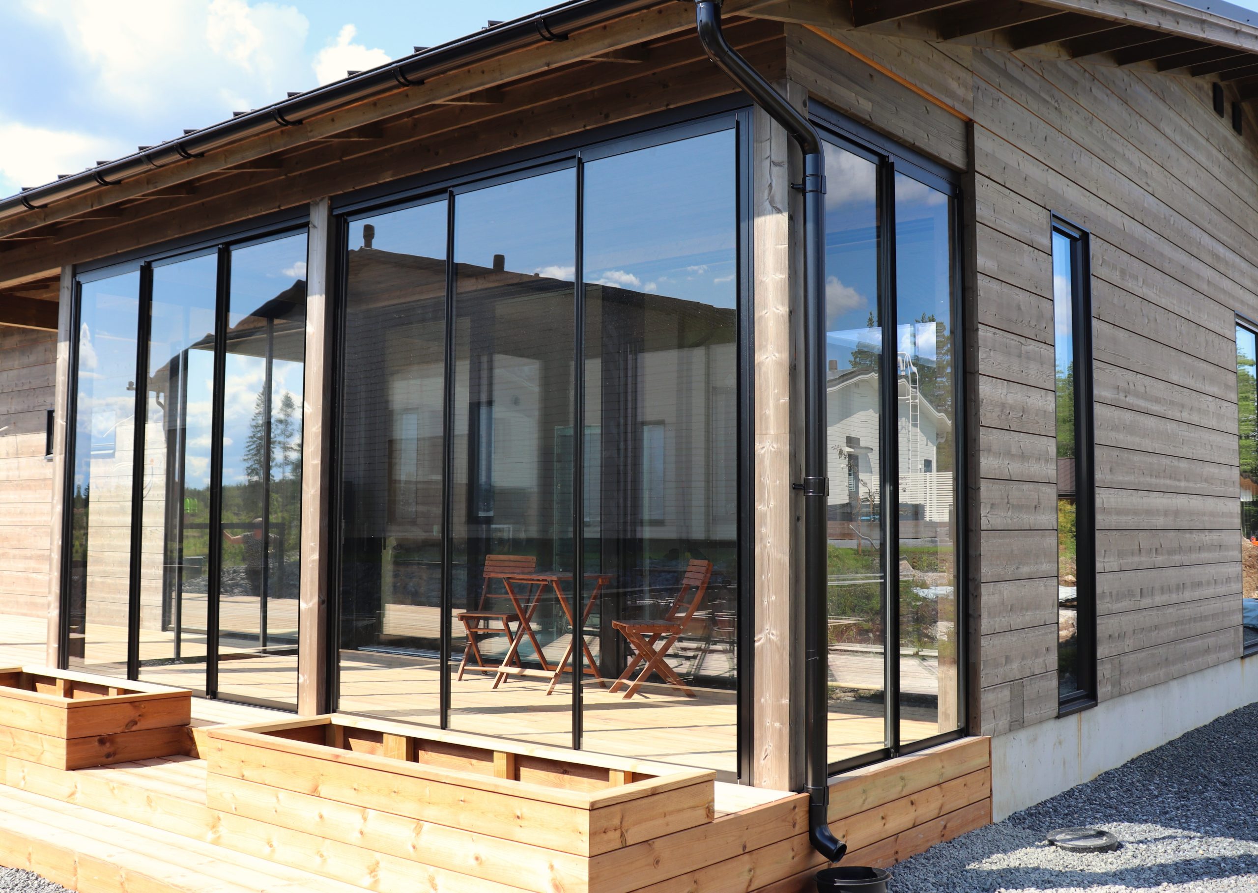 Kiinteää lasitusta voidaan hyvin käyttää terassilla yhdessä avattavien lasitusten kanssa.